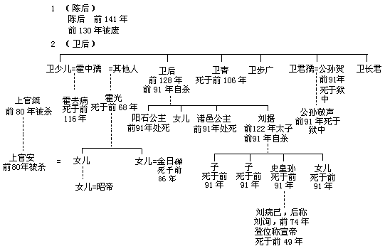 一种更复杂的国内局势成了武帝时期的特色。一批外戚担任了国家的高级官员;从政者能够把他们的女儿嫁给皇室的成员;最后他们成了国丈。政治的倾轧已与帝位的继承问题联系起来。某个政治家及其同伙的失势,或他政策的失效,可能取决于皇后或太子的命运。