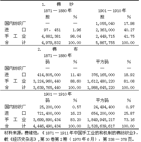 所以洋纱流入量增加的最明显的后果,就是原来在十九世纪上半期集中在主要产棉省的手工织布业向各地分散。虽然较老的织布中心在一开始就受到了打击,但它们为了在原来的市场上竞争,也不得不采用机制纱。从十九世纪九十年代后期起,日本纱在沙市和汉口地区开始被大量用作经纱。虽然进口棉纱没有在江南获得巨大市场,但江南的手工织工在二十世纪初期成了上海日益发展的棉纺厂的产品的主要购买者。此外,机制纱的采用加强了整个手工织布业。用进口纱和手工纺纱混合织成的布在价格和耐用方面都特别适合当时的中国市场。使用国产原棉的家庭纺织业在中国农村的许多地方仍占重要的地位,但相当大的一部分在市场出售的纺纱首先被进口纱代替,后来又被通商口岸的华资和外资纱厂的机制纱代替。