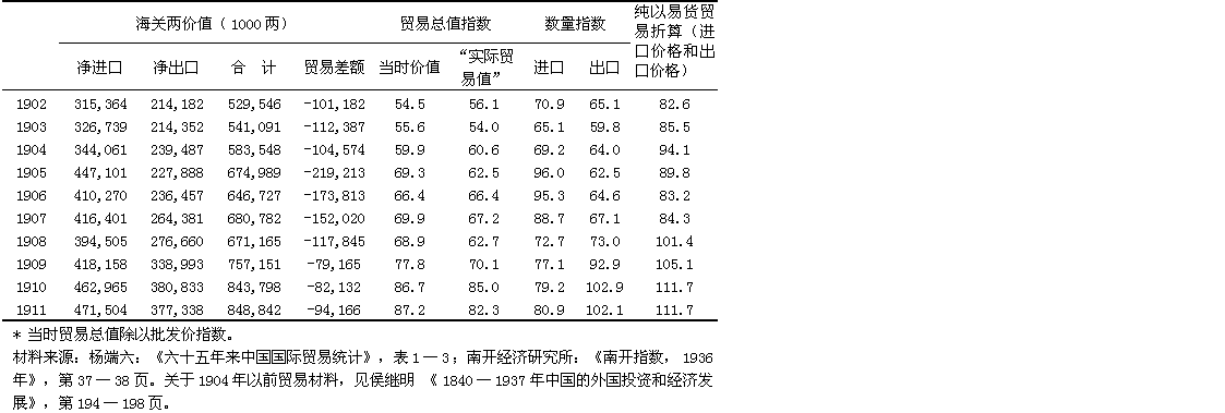 按当时的海关两计算,总贸易量从1870年到1911年增至七倍多。如上所述,银的价值夸大了贸易的实际增长:按贸易量计算,在这四十年中进口增至312%,出口增至307%。贸易的总增长率以当时的价值计算,在十九世纪九十年代前是比较慢的,而在二十世纪第一个十年增加得最快。数量指数表明进口的增长相当稳定(1905—1906年的猛增是日俄战争的直接结果,不应把这两年当作典型),而出口在十九世纪九十年代比较呆滞,但在清朝最后几年迅速增加。出口猛增的原因是主要从满洲输出了大豆和豆制品。如果把1888年前的贸易数据加以调整,进口以成本、保险和运费之值计算,出口以离岸价格之值计算,并且把鸦片和其他商品从香港“走私”入境的情况考虑在内,1870—1887年中国的对外贸易很可能出超。1888—1900年,进口有限地超过了出口,每年平均入超40,876,000海关两。1900年以后入超大大增加,1901—1911年每年平均达121,377,000海关两。一部分逆差被华侨的侨汇所弥补,到1900年为止还被少量净出口的金银所弥补。其余部分则被流入的资本所弥补,这部分资本包括上述1895年以后的工业投资和下面将要讨论的清政府借的债款。