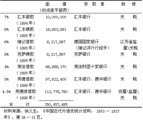 在1894至1911年期间,清政府向外国人签订的贷款达746,220,453两库平银。其中330,587,160两贷款用作兴建铁路之用,以后用铁路本身的收入偿还。虽然有几项借约给予承受抵押的外国人以实际经营特权和采购材料时的丰厚佣金,但铁路贷款本利的偿付并不意味着给中央政府的正常收支直接增加负担。为工业目的而借的借款都比较少,共25,517,349两,其中为架设电报线和购置设备而借入的资金为5,452,783两,杂项用途的借款为647,812两。工业借款主要包括日本债主借给半官办的汉冶萍公司的贷款。汉冶萍公司无力偿还这笔债款,债务越陷越深,于是就给日本提供了借口,把正式承认日本控制该公司的内容列入1915年的“二十一条”要求之中。