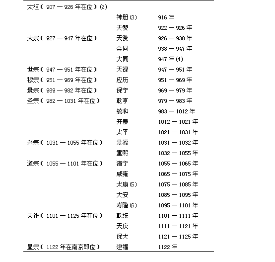 (1)本表所列年号来自《辽史》,卷1—30。《契丹国志》所记略有不同。见[327]慕阿德:《中国的统治者》,第91—93页、第97页的表格。