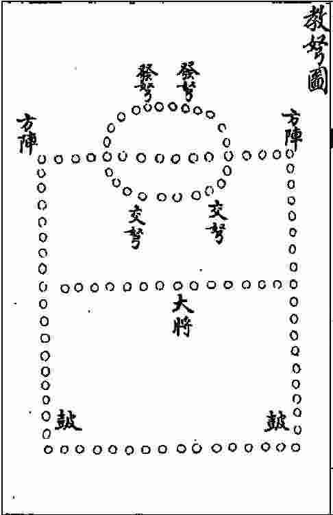 凡教旗帜,平原旷野登高远视处,大将居其上,南向。左右各置鼓一十二面,各树五色旗,六纛居前,列旗节次之。监军使御史裨副次,左右衙官队如偃月形为后骑。下临平野,使士卒目见旌旗,耳闻鼓角,心存号令。乃命十将左右决胜将总一十二将一万二千人去。兵刃以精新,甲胄幡帜分为左右厢,各以兵马使为长,班布其次。阵间容阵,队间容队,曲间容曲。以长参短,以短参长。回军转队,以后为前,以前为后。进无奔迸,退无遽走孙子所谓“纷纷纭纭,斗乱而不可乱;浑浑沌沌,形圆而不可败”者,此之谓也。以正合,以奇胜。听音视麾,乍合而乍动之便也。每一阵分校四校皆有立校,五校各立将军校尉,以准于古。每校亦各自阵数,其分布队伍皆准图之逐部兵器率以枪战。戈钲居首队而包于弓弩焉包于弓弩,一作包弓弩于十。左校以青龙旗表之,右校以白虎旗表之,中校轩辕大将所处。左鼓右旗,四阵普同。谓之一队者,三十五人。一部者,二十队也。每一校不常其部,各列阵数应敌之势,贵战斗之际前后不相交乱也。飞鹗阵,前校出首骑者,所以为重也。前出一部为觜,次四部为面,余五部包之于首。左右校出骑兵者,内以副身,外以副项及首也。夫鹗以搏击为俊,故阵欲觜爪之利焉。重霞阵,卫其不动,即分两穗从旁击焉。敌若惊乱,前校骑兵两穗进击。步士则不可轻进,但在本处受战。若前冲骑退即前校骑兵进,前校骑兵退即前冲骑兵进。夫云霞以开阖进退不常其法,故前校骑兵往来氤氲以象之也。长虹阵及八卦阵,皆有冲实。外以安敌之不意,内以卫大阵也。夫长虹以为名者,取阵形弯前扼敌之势。八卦以名之者,取八面受敌之象也。凡四阵逐步结阵之法,横七队为首,横七队为身,横六队为尾。部兵每一部横七十步,首横七十步,厚十步,身亦如之,尾横六十步,厚十步。身去首二步,前后并同。骑兵每一步横一百四十步,厚六十步八步,首横一百二十步,厚二步,身亦如之,尾横一百二十步。身去首四步亦如之。受战之时,大阵不可辄动,敌众未薄则大敌离。于是三令五申:白旗点,鼓音动,则左右厢齐合;朱旗点,角声动,则左右厢齐离。合与离皆不离中央之地。左厢阳回而旋,右厢阴回而旋,左右各复本位。白旗掉,鼓音动,左右各云蒸鸟散,弥川络野,然而不失部伍之疏密;朱旗掉,角声动,左右各复本位。前后左右,无差尺寸。散则法天,聚则法地。如此则三合三离,三聚三散。不如法者,吏士罪之,务从军令。于是大将出五彩旗十二口,各树于左右厢阵前。每旗用壮勇士五十人,夺旗者胜,失旗者负,胜赏而负罚。离合之势,聚散之形,胜负之理,赏罚之信,因是而教之。