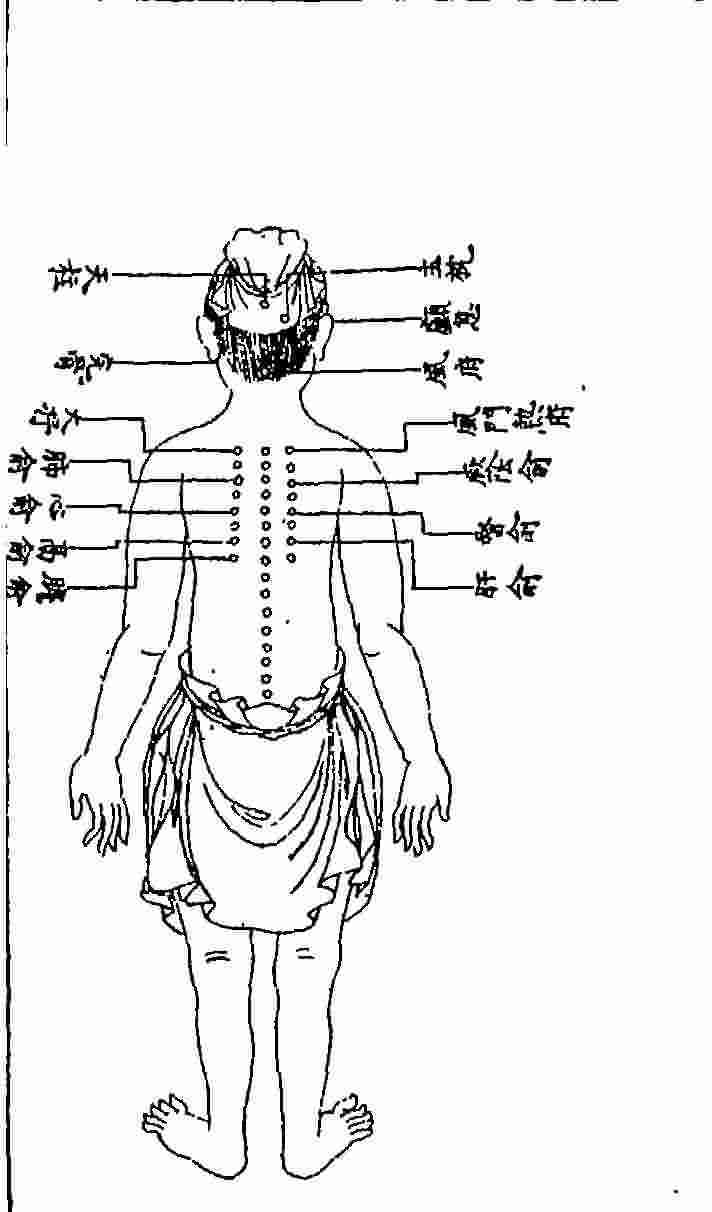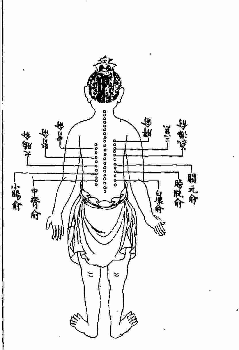 脊俞一穴,一名“神宗”,一名“脊中”。在第十一椎中中央。督脉氣所發。治風、癎、癲,邪温病,積聚,下利。忌灸。針入五分。