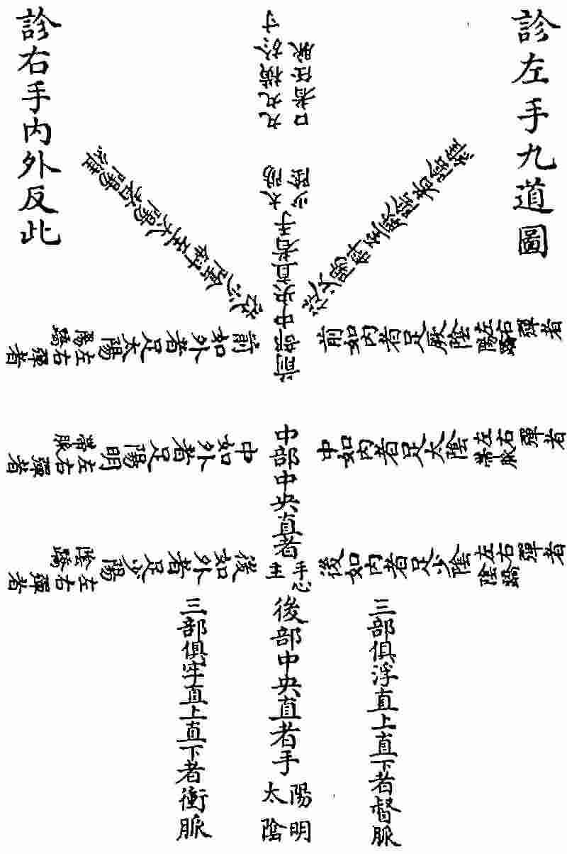 李濒湖曰:气口一脉,分为九道,总统十二经,并奇经八脉,各出诊法,乃歧伯秘授黄帝之诀也。扁鹊推之,独取寸口以决死生。盖气口为百脉流注朝会之始,故也。三部虽传,而九道沦隐,故奇经之脉,世无人知,今撰为图,并附其说于后,以洩千古之秘藏云。