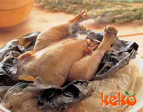 4.将鸡移置玻璃纸上,分别裹上3层,以麻绳捆绑,再分别裹上荷叶2层,同样以麻绳绑紧,然后包上锡箔纸,放置烤箱中,用中火烤约2.5小时即可取出,盛入盘中上桌供食。