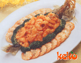 16.同时另取锅放入熟猪油15 克烧热,放人番茄酱、白糖、醋和水150毫升熬稠起光泽时,即均匀地浇在鱼片和蟹上,立即将凤尾虾的尾部向外围在四周即成。