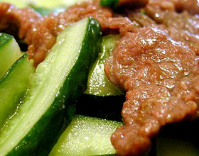3.锅中留油30克,爆香葱段后将葱段夹出,黄瓜倒入锅略加煸炒1分钟左右,加入肉片同炒,最后以生粉水20克(生粉10克加水)勾芡,即可盛盘供食。