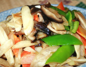5.将茭白、青椒、冬菇,放入热油中氽透;