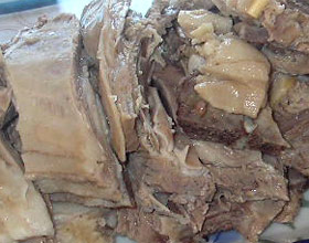 2.切块、煮制:取宁夏特产羯羊宰杀后,去内脏、头、尾、四肢再切成1千克左右的大块,投入开水锅中加花椒、小茴香、八角、桂皮和杏仁、陈皮等调料,盖锅炖煮,待炖至提羊骨一抖,骨肉分离时即可取出。