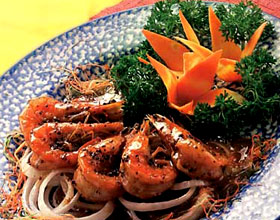 推荐菜谱: 香蒜炆虾 珍珠肉丸 炸龙肠 三彩大虾 炒虾粒豆腐 黄焖带皮虾