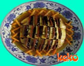 2.鸭晾凉后剔去骨头,鸭肉切成长4 厘米、宽1 厘米的条状,鸭皮朝下整齐的摆在大碗中(不要太满);