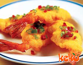 煎焗瓤明虾:'1.猪肉剁细成馅备用;2.将每只剪净明虾从肚部切开两边,不可切断,用淀粉涂匀肚内,瓤入猪肉馅30克,抹上鸡蛋,拍上面包屑;3.将炒锅内猪油烧热,用文...