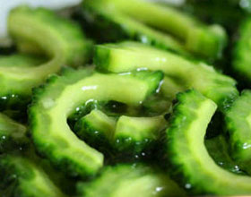 冰镇苦瓜:'1.将苦瓜切成两半,去掉瓤,切成长薄片;2.将苦瓜片放入盆中,加适量水,冰块拌匀,入冰箱放15分钟;3.将苦瓜放入深盘中,倒入醒目冷饮即可,上桌时带...
