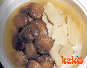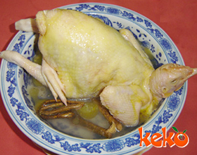 归芪炖老母鸡:'1.将归芪用温水洗净后改成小片;2.将老母鸡宰杀后,脱净残毛,掏去内脏,用刀宰成小块;3.放入有姜、葱、料酒的沸水中氽去血水待用;4.鲜汤烧沸后下归...