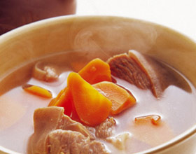 双参羊肉锅:'1.羊肉剁2厘米见方的块,放入沸水中冒去血沫;2.用清水冲洗干净,放汤锅中加葱、姜块、盐等调料,用慢火炖至肉软汤浓;3.山药、胡萝卜去皮切滚刀块,...
