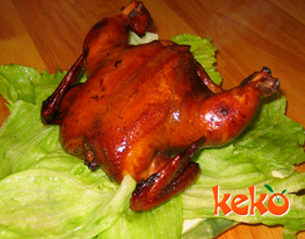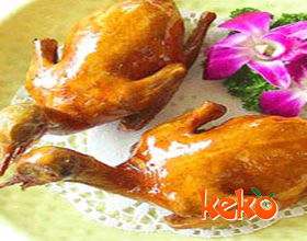 烤小鸡:'1.将加工好的子鸡从脊背中间劈开,再将鸡的大腿处割一刀,去掉爪尖,鸡翅膀用刀拍断;2.然后将鸡周身均匀地抹上一层酱油,下入八成热的油中,冲炸一下...