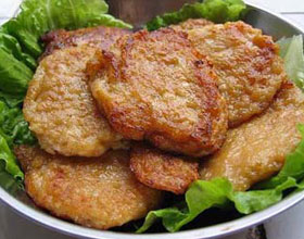煎慈姑饼:'1.将慈菇去皮洗净磨成茸;2.草鱼宰杀治净,片取去皮净肉剁烂成茸;3.虾米、腊肉(肥腊肉)分别切成米粒状;4.将慈菇茸、鱼肉茸、虾米、腊肉米一同用盆...