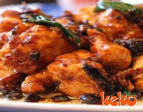 豆豉鸡:'1.将仔鸡(净仔鸡半只)剁成约2.5厘米见方的块洗净,用湿淀粉20克(淀粉10克加水)上浆。2.将勺内加油,烧热放入豆豉末、黄酱炒香,放入鸡块煸炒,再...