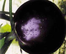 圆茄,果为圆球形,皮黑紫色,有光泽,果柄深紫色,果肉浅绿白色,肉质致密而细嫩;