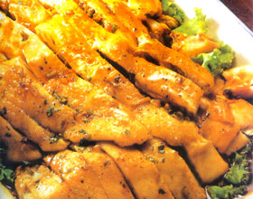 怪味鸡块:'1.鸡杀净,去内脏,整只入锅煮熟后,捞出放进冰水中冰透。2.鸡沥干水分,去头、腿、爪,剁成2厘米×5厘米的长方块,整齐地排在盘中。3.姜末、蒜泥、酱...