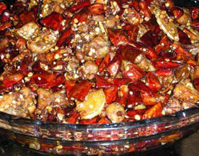 6.锅内留50克油,下入红辣椒,加盐炒一下再下入花椒粉、大蒜和兔肉,烹料酒,倒入兑汁,翻炒几下,装入盘内即成。