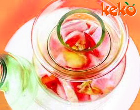北京泡菜:'1.将大白菜择洗干净,控去水分,剥下外层的菜帮,劈成两半;2.白菜心从头部劈成四半,再改刀切成约5 厘米长的段;3.将苹果、梨一起放入搪瓷盆内,下入...