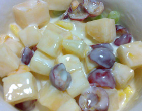什锦水果沙拉:'1.将火龙果、鲜菠萝、香橙、草莓、香蕉洗净;2.切成大小一致、均匀的小丁,用鲜橙汁搅拌均匀即可。...