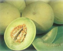 成熟的白兰瓜呈圆球形,个头均匀,皮色白中泛黄,外形十分美观。切开后瓤口碧绿,肉厚汁多,脆而细嫩,清香扑鼻。