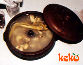 7.取炖盅一个,按顺序放入猪肉、蚬鸭、虫草、姜、葱、味精、精盐、黄酒、开水1500毫升,加盖入蒸笼用中火炖约2 小时;