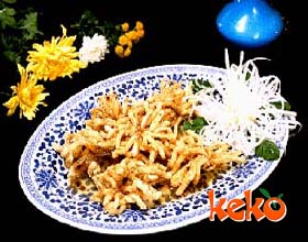 5.炒锅置旺火,下入花生油,烧至七成热,将鲈鱼生坯用干淀粉抓匀后下锅,炸2 分钟至鱼块卷成菊花形时,用漏勺轻轻捞起,沥干油后盛入盘中,再饰配菊花叶形芥蓝菜叶;