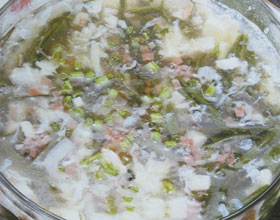 2.锅内添水烧开,下入莼菜、银鱼段、内脂豆腐丁,加盐调味,用淀粉勾芡,淋入蛋清,撒上火腿末、香菜末、滴入香油即可。