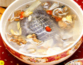 3.甲鱼肉放入蒸盆中,加入枸杞、精盐、料酒、花椒、姜片、葱段、1000克鸡清汤,盖上背壳,入笼蒸一小时取出,趁热服食。