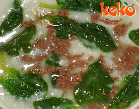 4.将姜丝、葱丝、盐放入肉粥中调好味,再放入菠菜煮熟即可。