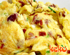 2.鸡蛋加调味料拂匀,加入叉烧、韭黄又拂匀,炒熟上碟。