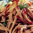4.炒锅上火,放油烧至四成热,下肉丝滑散捞出;