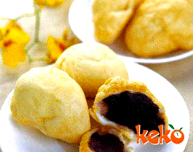 炸雪丽豆沙:'1.蛋清放盘中抽打成泡沫状,加干淀粉搅匀成雪丽糊。2.豆沙馅做成10个直径2.5厘米的丸子,蘸雪丽糊旋转后轻轻提起;放温植物油中炸透,呈乳白色时盛入盘...