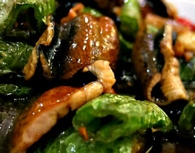 麻辣鳝片:'1.鳝鱼杀好后,剔除大骨并切除头及尾尖(只取用鳝背部分),全部切成1.5寸长段,用酱油10克及生粉10克拌匀;2.青红椒分别去籽切成1寸四方块,备用;3.大...