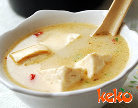鱼头豆腐汤:'1.鲢鱼头洗净,去掉鳞,在近头背肉处深剞2刀,涂上豆瓣酱,抹上酱油腌渍。冬笋洗净切片蒸熟。青蒜洗净切成段。姜洗净切末。2.将豆腐切成长4厘米、厚1...