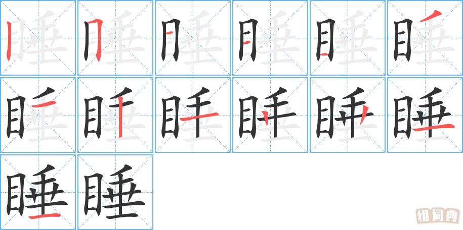 睡的总笔画 13 笔,笔画顺序:1.丨(竖) 2.𠃍(横折) 3.一(横) 4.一(横) 5.一(横) 6.ノ(撇) 7.一(横 ) 8.丨(竖) 9.一(横) 10.丨(竖) 11.丨(竖) 12.一(横) 13.一(横)。