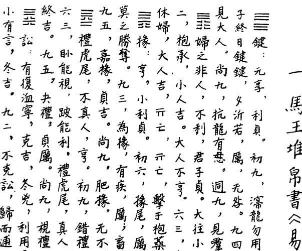 这就是著名的《马王堆帛书周易》,是出土的古物,和通行本《周易》内容上有不少的出入,比如大名鼎鼎的乾卦和坤卦在这个本子里却写作“键”和“川”。评书里的英雄制止坏蛋恶行的时候常有一段套话:“光天化日,朗朗乾坤,你竟敢私闯民宅,调戏良家妇女,该当何罪!”如果按帛书版本把两个重要文字换一下,这句话改成:“光天化日,朗朗键川,你竟敢私闯民宅,调戏良家妇女,该当何罪!”——这是不是感觉怪怪的?英雄可能自己说着就没底气了,没准儿还能把坏蛋给逗乐了。