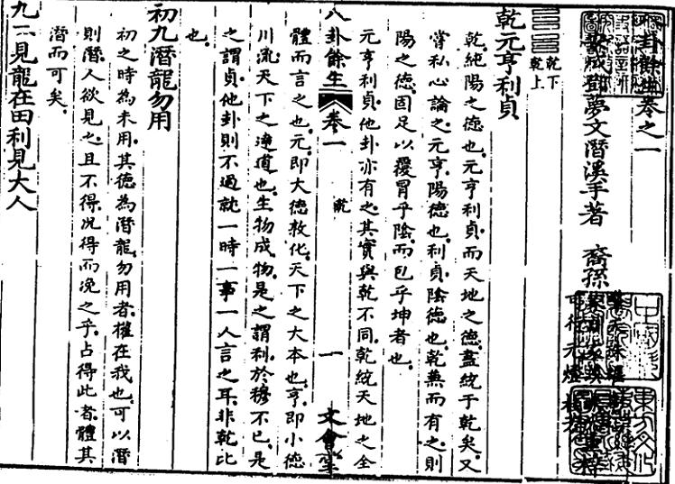 元人董中行说:乾卦的六爻都是奇数爻,都是阳爻,在所有的六十四卦里,只有这个乾卦纯粹都是阳爻,这就叫“阳之纯,健之至”,所以才叫乾。周文王认为国家领导人的才能和道德品质都是最拔尖的,所以政令才会畅行无阻,做事圆融无碍,这就是所谓“元亨”,而领导人只有一直端正思想态度,全心全意做好事,不要腐化堕落了,“元亨”才能保持下去。也就是说,领导人如果心术不“贞”,也就做事不“利”,也就达不到“元亨”之境。