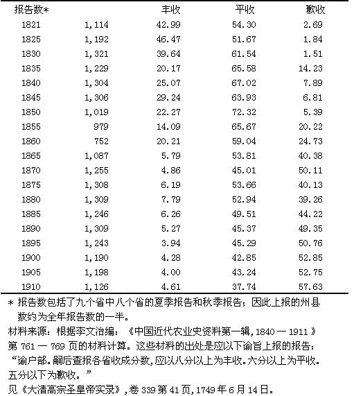 表四 1821—1910年期间九省上报丰收、平收和歉收