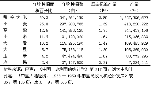 只可能对十九世纪末典型的一年的主要作物产量作出非常粗糙的估计。光绪版(1899年)《大清会典》中关于耕地面积的材料——经过一定的调整,1887年的官方数字为847,760,554亩——经细致分析是不完整的,从各个方面说都大大低估了实际种植面积。许多地方的基本测量单位是把不同等级的土地折成统一标准的“财政”亩;1712年以后开垦的一些土地仍未登记;地方权贵的财产在税册中一直没有得到充分反映。也不清楚少报土地的精确数字,但根据巴克在1929—1933年农业调查的结果,把数字往上调整三分之一还是很保守的。这样,十九世纪后期的耕地(我假定它相当于作物种植面积)可能为1,130,344,579亩。还没有十九世纪各种作物种植总面积所占比重的详尽材料。但是,如果巴克作出的1929—1933年各作物百分比的平均数和中央农业实验所作出的1931—1937年的百分比平均数因表五所列1904—1909年和1930—1933年期间的变化趋势而被调整,人们就可能对清朝最后几十年的状况作出一个近似的估计。根据这些估计,表六至少可以提供一个关于十九世纪后期主要作物产量的似乎可信的测算。