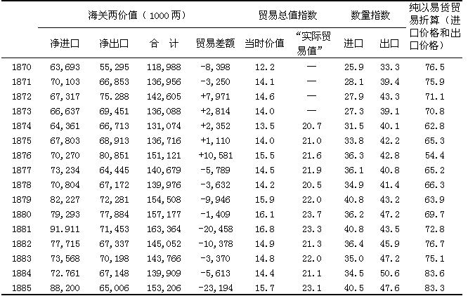 按当时的海关两计算,总贸易量从1870年到1911年增至七倍多。如上所述,银的价值夸大了贸易的实际增长:按贸易量计算,在这四十年中进口增至312%,出口增至307%。贸易的总增长率以当时的价值计算,在十九世纪九十年代前是比较慢的,而在二十世纪第一个十年增加得最快。数量指数表明进口的增长相当稳定(1905—1906年的猛增是日俄战争的直接结果,不应把这两年当作典型),而出口在十九世纪九十年代比较呆滞,但在清朝最后几年迅速增加。出口猛增的原因是主要从满洲输出了大豆和豆制品。如果把1888年前的贸易数据加以调整,进口以成本、保险和运费之值计算,出口以离岸价格之值计算,并且把鸦片和其他商品从香港“走私”入境的情况考虑在内,1870—1887年中国的对外贸易很可能出超。1888—1900年,进口有限地超过了出口,每年平均入超40,876,000海关两。1900年以后入超大大增加,1901—1911年每年平均达121,377,000海关两。一部分逆差被华侨的侨汇所弥补,到1900年为止还被少量净出口的金银所弥补。其余部分则被流入的资本所弥补,这部分资本包括上述1895年以后的工业投资和下面将要讨论的清庆祝借的债款。
