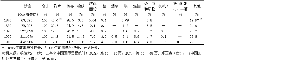 鸦片主要来自印度,它在1890年前是输入中国的最重要的一项进口货,以后则被棉布所超过。按价值算,棉布和棉纱一起在1890年以后约占中国进口值的三分之一。棉花贸易和它对中国经济的影响已在上面与手工业合并讨论了。粮食和其他食品的进口主要是为了供应沿海的大城市,进口多少似乎视地方收成后的供应情况而不是视收成的一般好坏而定;这一贸易既反映了沿海城市的发展,也反映出在供应沿海城市的外围贸易区外面种植的本国粮食面临着拥挤的交通和高昂的销售成本的状况。中国主要进口货的百分比列于表十七,出口货的百分比列于表十八。