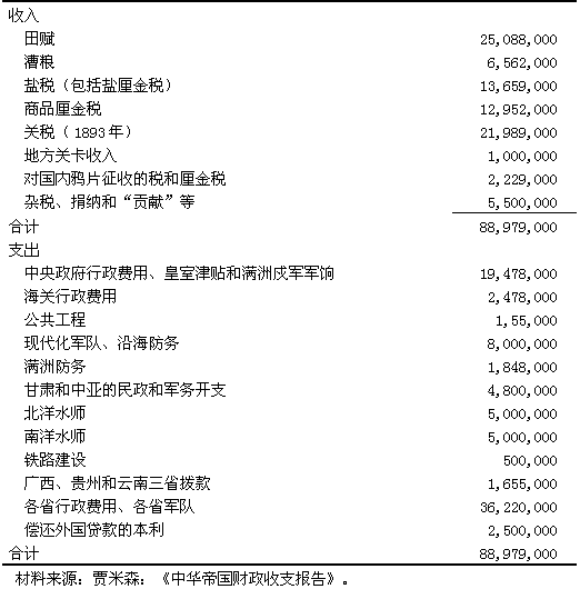 表二十一所列为十九世纪九十年代初期典型的一年北京一切来源的收入和主要开支项目的估计数。各项收入数字并不表示实际解交京师的税收数;它们是每年(分两次)上报户部的数额。这些上报的收入那时以货币或实物分存于几个省,等待户部的调拨。中央的国库不编制收支综合预算。(维新派未实现的计划之一就是要编制正规的全国预算。)相反,不断发生的开支项目逐渐在某些特定省的特定税收中一笔一笔地支用。结果,上报总数中的一部分由各省留用,以支付以后地方上的民政和军费开支,第二部分上缴北京(或根据户部的指示解交其他地方),在某种情况下,还有第三部分作为协助款项转拨他省。这种财政制度适合于短程的运转,而传统惯例的压力使它不能对紧急的需要作出迅速反应。由于太平军叛乱和十九世纪中期其他的叛乱,北京对帝国各项收入来源的控制已被削弱,财政制度也严重地被打乱。但是与清朝的最后十七年相反,由于有了新收入的支持,庆祝的民政和军费开支在1894年以前可以得到解决而不用向国外大举借债,正常的收入还进而被用来分期偿还已经借入的数目不大的外国贷款。当然,对现代化海军和洋式军队的大量投资收益甚少,这可以从1895年以前洋务运动的军事和工业项目所取得的微小的成绩中得到证明。